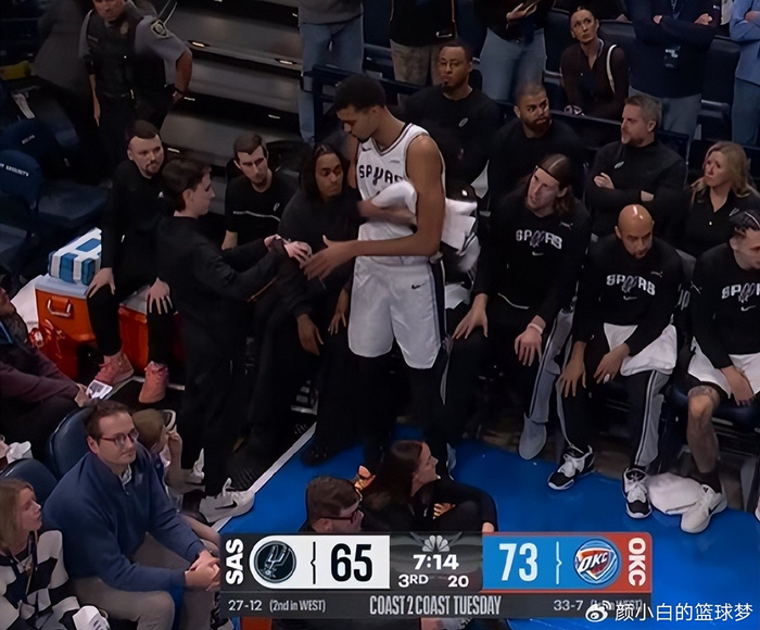 末节,乔命中三分后沃特斯回应三分,文班亚马与霍姆格伦又缠在一起响哨,文班亚马再造犯规裁判看回放没升级,文班亚马两罚一中后被吹进攻干扰球,哈珀三分命中,卡斯尔犯规,凯尔登三分命中缩小到12分,马刺犯满送SGA罚球两罚全中,尚帕尼再来一个三分,卡鲁索反击命中,亚历山大再造犯规两罚全中比赛已经失去悬念。
