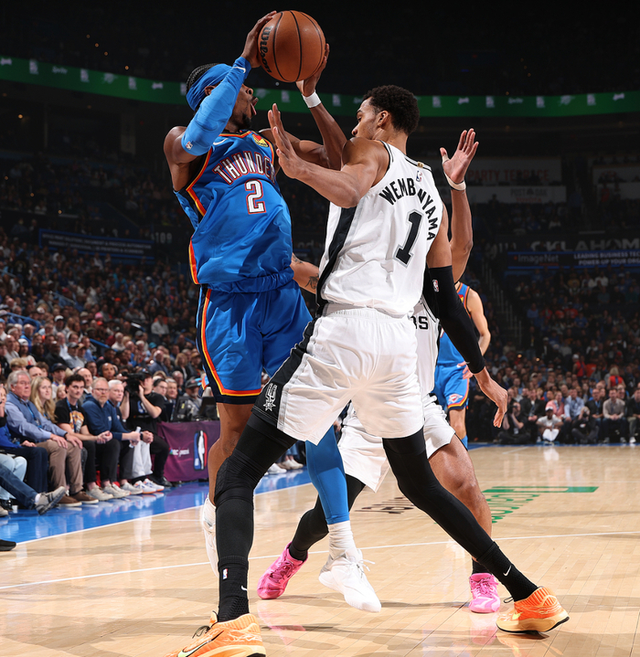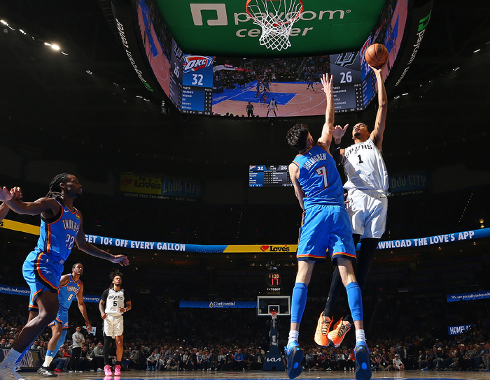 这是本赛季雷霆与马刺的第四次交手,前三次都是马刺取得胜利,联盟第一的雷霆极度想要挽尊完成复仇,开场两队拼防守就非常凶猛,文班亚马完成了隔扣霍姆格伦的大戏。SGA被贴防影响,好在卡森与威金斯分别命中三分。卡斯尔连拿五分回应,科内特两个前场篮板马刺都得分,米切尔突破得手,亚历山大造2+1马刺立马暂停,亚历山大再度命中反超,首节打完雷霆32-26领先马刺。